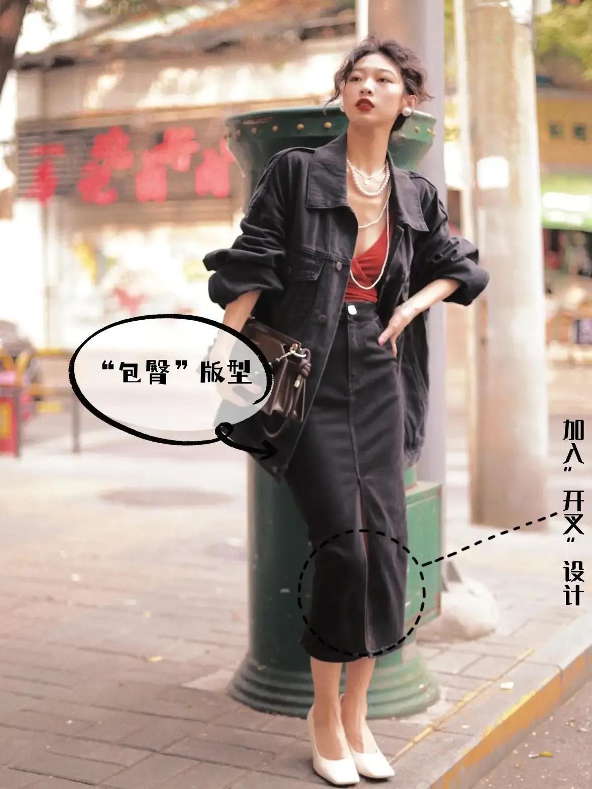 想要穿的比较休闲的情况下,我们可以选择黑色的牛仔外套搭配上黑色的开叉直筒半身裙,里面搭配上红色的大V领打底衫,脚上穿的是一双白色的方头浅口单鞋,这一身穿衣打扮复古洋气。