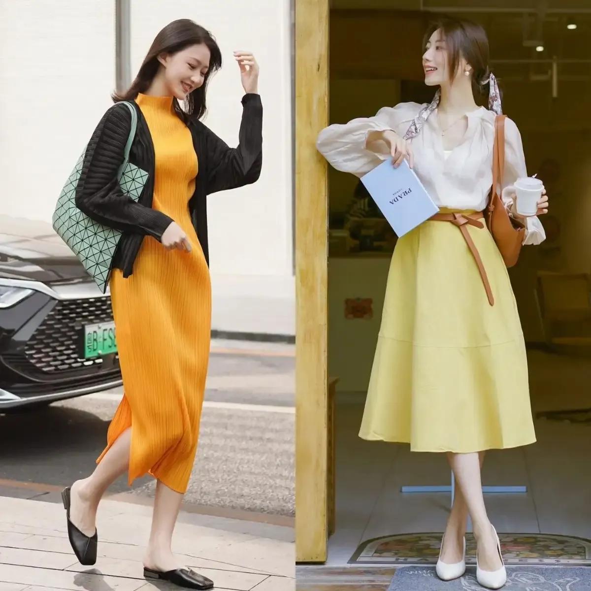 当然,身高不同,选择的鞋子款式自然有一定的区别,本身身高已经是一米七五,甚至达到一米八的高个子女性,这个时候就没有必要去学那种细高跟鞋来穿搭了,例如下面左边的这位达人,身高比例就比较高,直接选择一件黑色的衬衫开衫搭配上黄色的针织连衣裙,脚踩一双黑色的平底穆勒鞋,选择平底的穆勒鞋依然显得高挑显瘦。