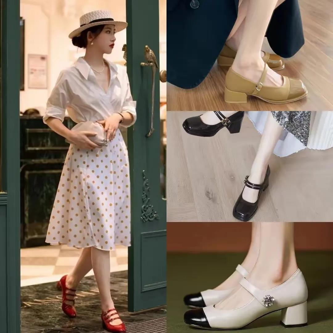 咱们还不如换成像下面这几双玛丽珍鞋来的实在呢,不管是选择红色还是黑白拼接的玛丽珍鞋或者是黑色的玛丽珍鞋,这几双鞋子都比较百搭耐看,很上档次,搭配上波点的伞状半身裙,加上小众设计的白色衬衫,头上加上一款草帽,为了让整个造型更精致,达人还选择了耳环,还有项链来点缀,瞬间秒变成时髦精。