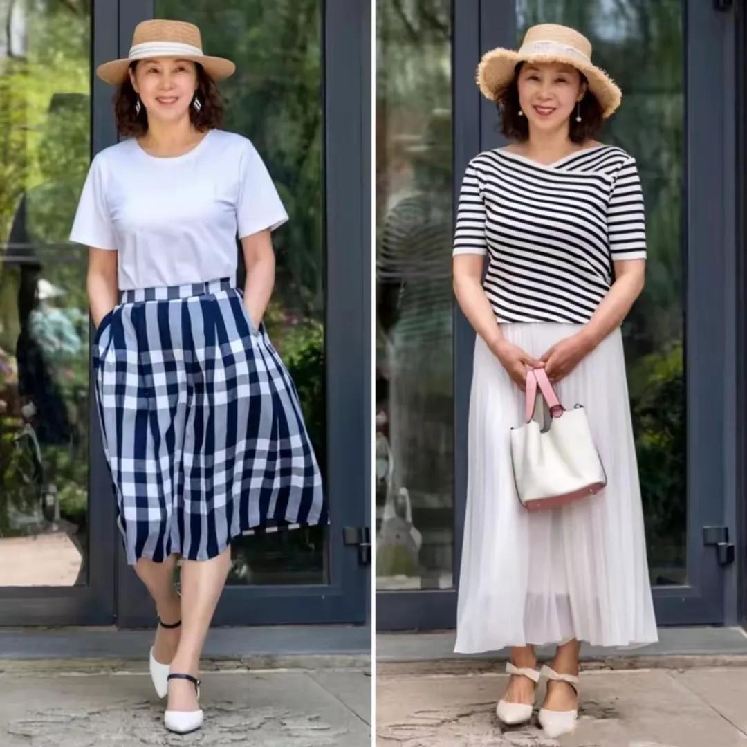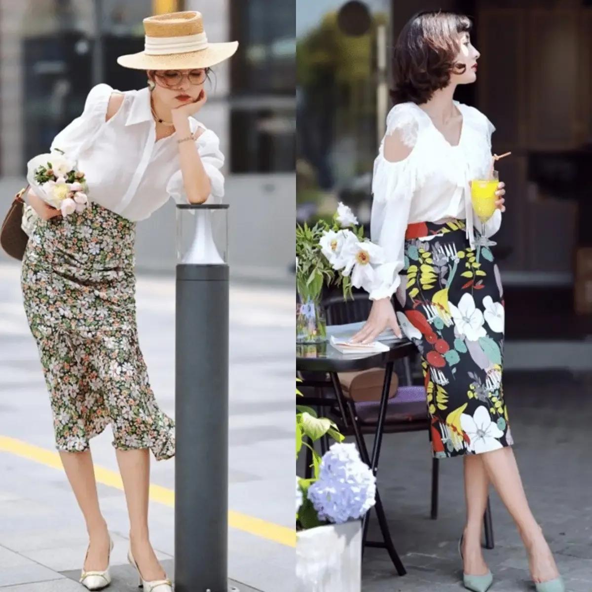 如果你觉得穿衣打扮过于单调,咱们可以像下面这两位达人一样,用白色的衬衫上衣搭配上碎花半身裙和印花的半身裙,脚踩一双浅口的高跟鞋,这两身穿衣造型就很精致,很洋气,更显年轻。