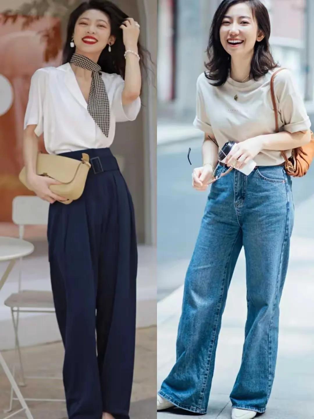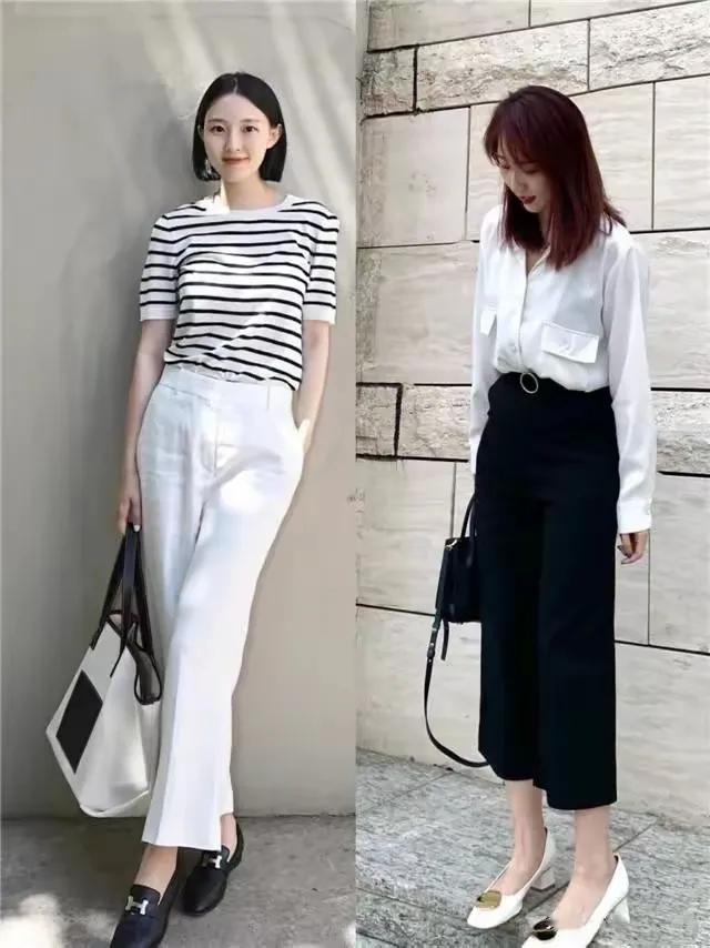 当然,也要根据自己的裤子颜色而定,比如说你选择的是像下面这一条白色的西装裤,搭配上黑白条纹的短袖,这个时候用黑色的热敷起来,组合最为经典,当你换成黑色的九分西装裤,那么我们就要换成白色的粗跟浅口大番茄来搭配最佳。