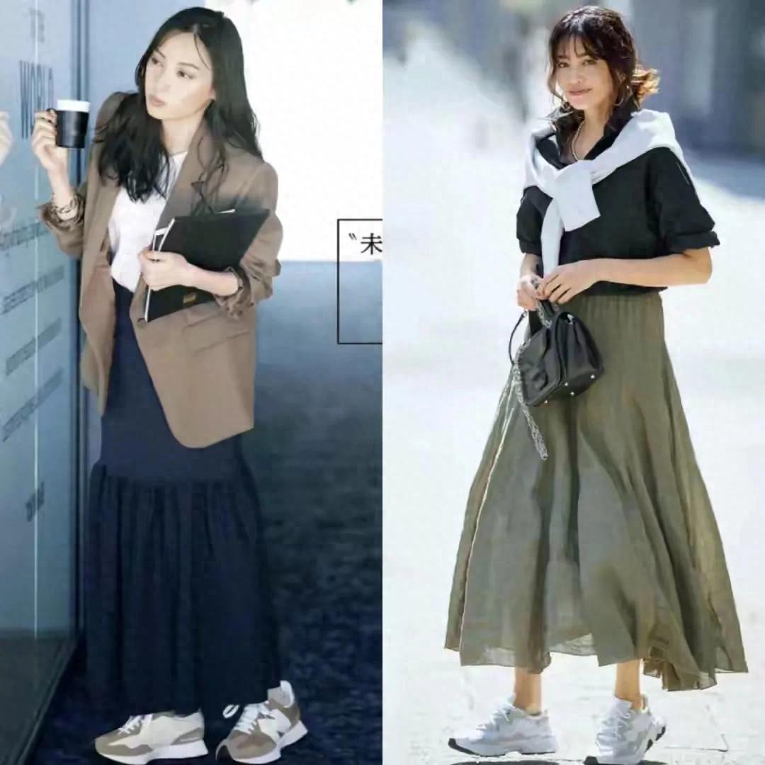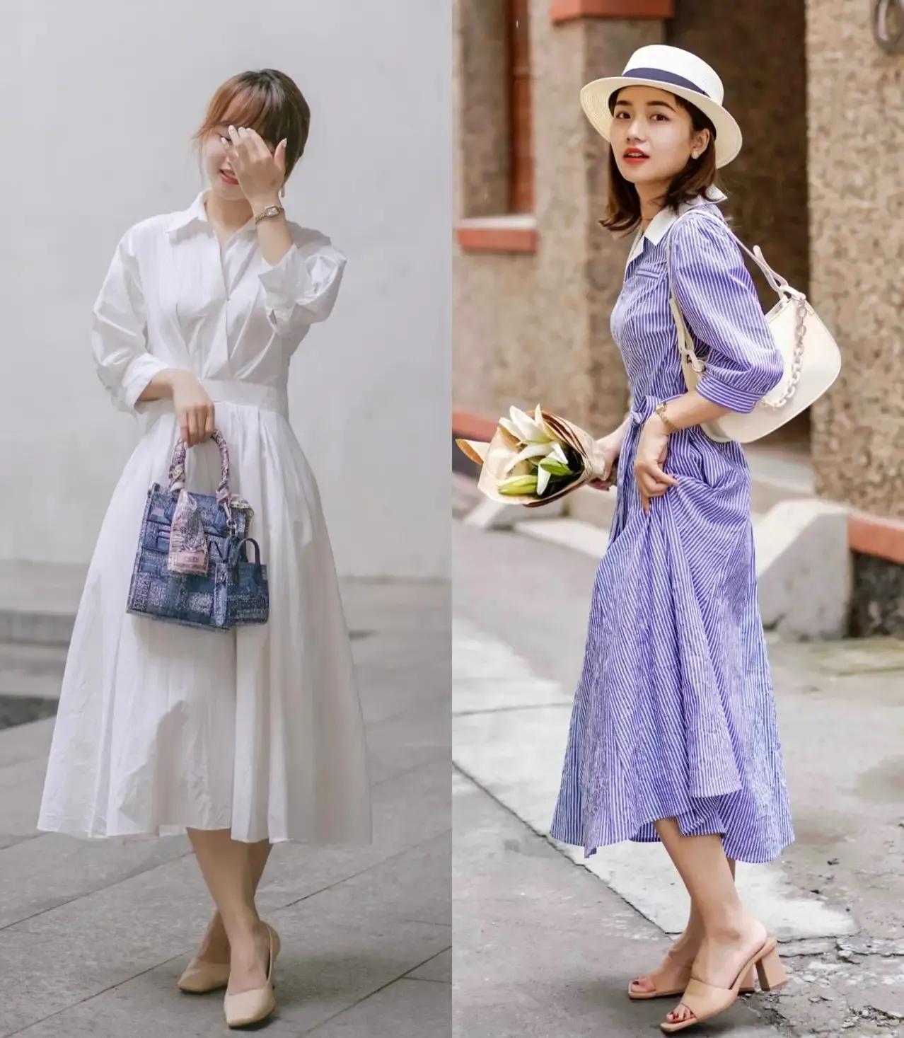 包括左边的这一套衬衫裙装穿搭也很不错,就算是腿粗胯宽,有螺旋腿的女性穿了也能把身材的这些缺点藏起来,小宽松设计的衬衫搭配上白色的伞状半身裙,脚踩双浅口的单鞋能很好的让你的腿部变得更加修长笔直。