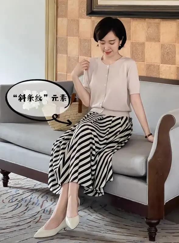 我们选择的鞋子颜色也尽量选择浅色系,纯色的,基础色的作为百搭,要不然的话,整套穿衣打扮会过于花哨,例如下面用斜条纹元素的半身裙搭配上针织开衫短袖,然后再用一双白色的低跟浅口单鞋来组合,瞬间让整个造型变得特别的大气。
