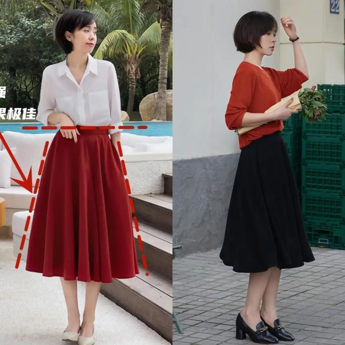 特别是小个子女生,还蛮推荐大家选择带跟的乐福鞋来穿搭的,例如下面右边的这一套穿衣打扮用的是红色的针织上衣,搭配黑色的伞状半身裙,脚踩一双黑色的粗跟乐福鞋,这一身穿衣打扮经典耐看,而且很精致,很时髦,就算再过五年这样打扮也完全没问题。